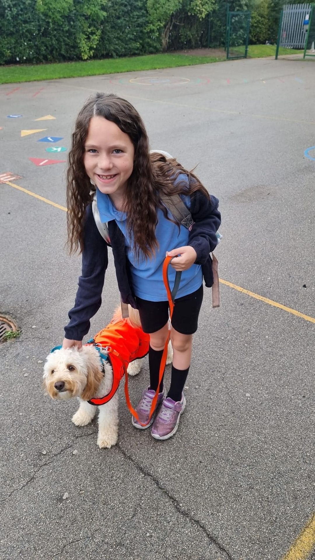 On Tuesday, our first day back, some children were a little anxious coming into school! So Archie our ’School Mentor’ dog walked them to class and all their worries went away.