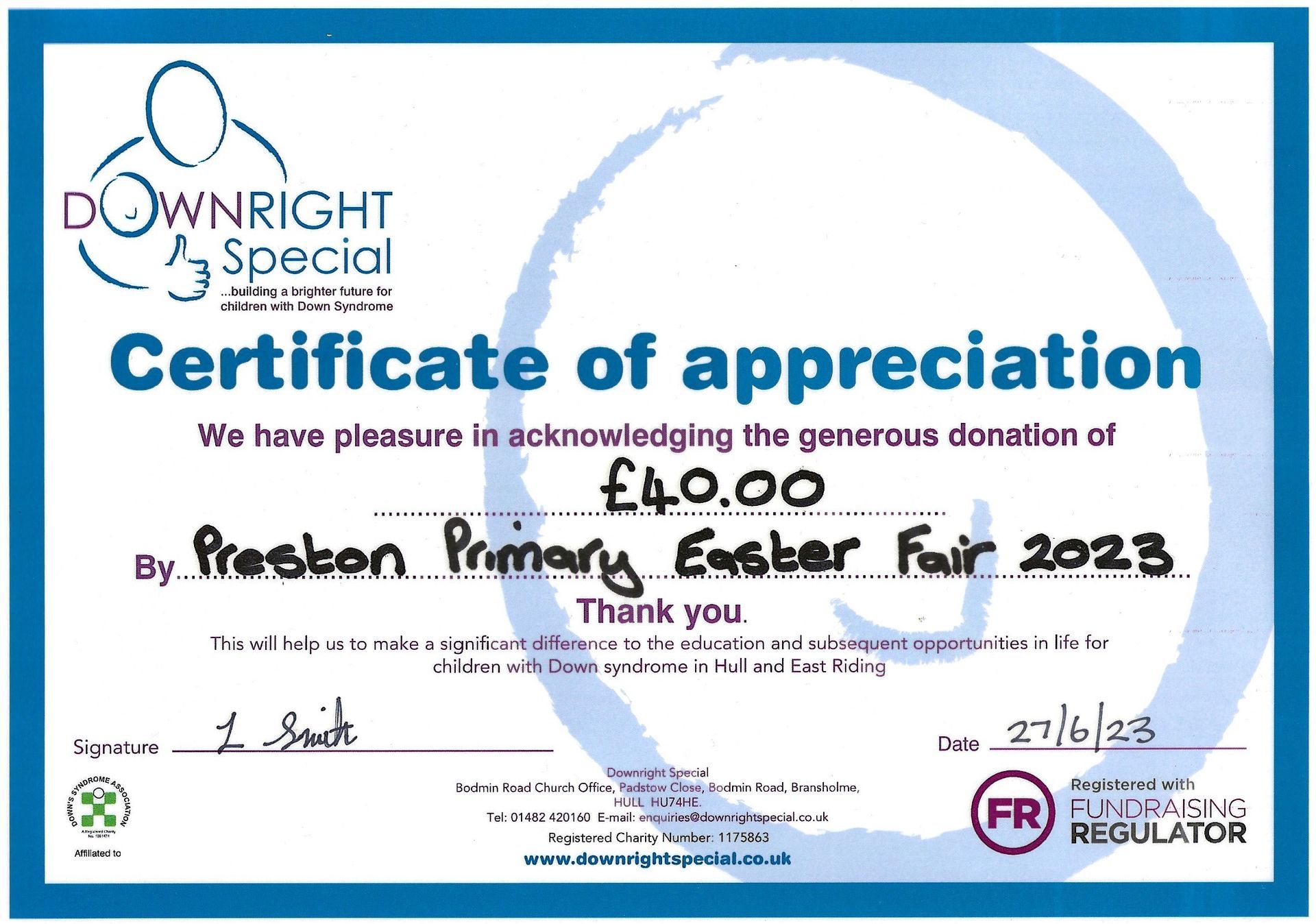 Today we received a certificate to say thank you from 'Downright Special'. Some of our children donated the funds they raised during the Easter fair to this local charity who supports one of our own pupils in school.