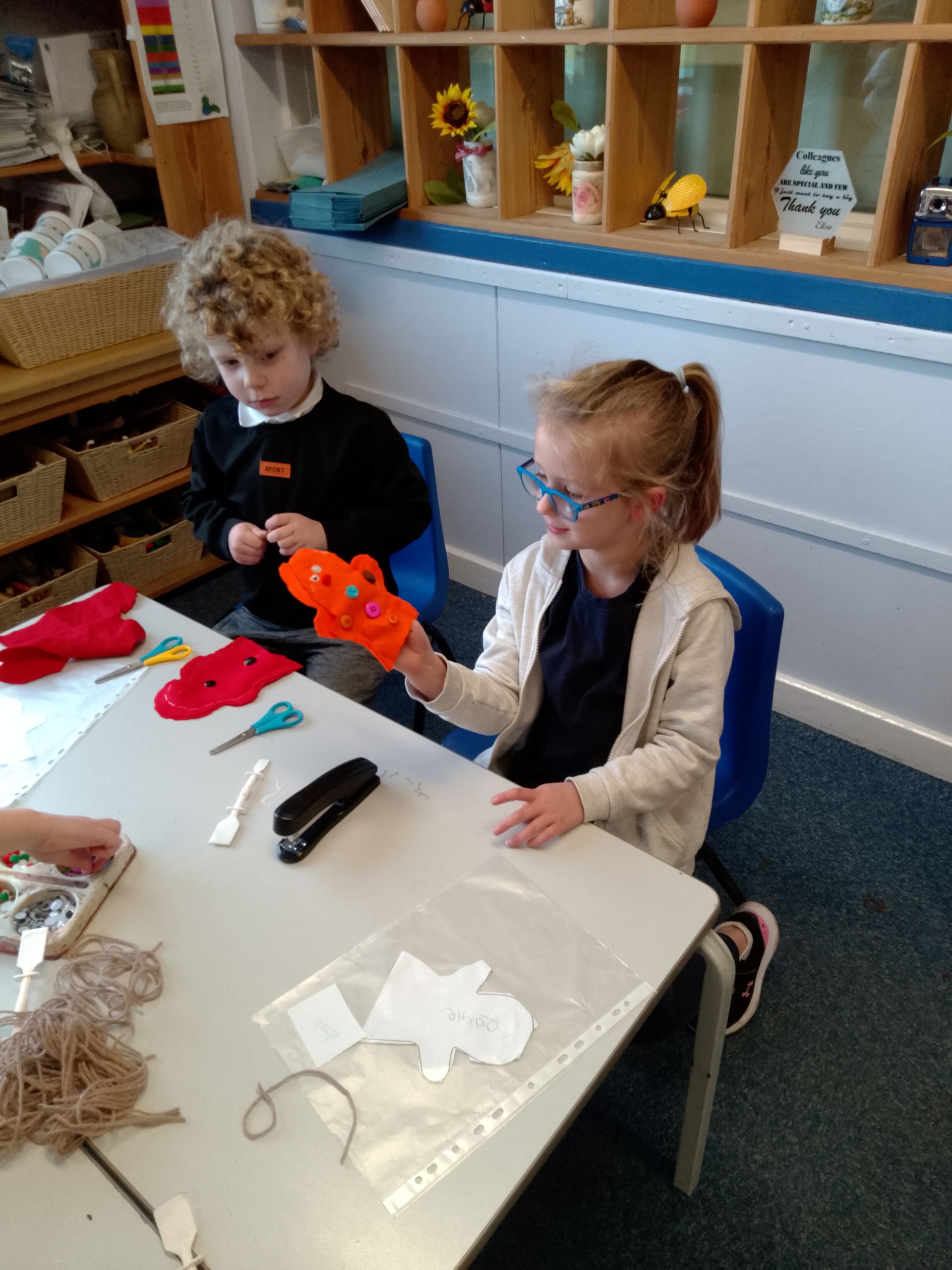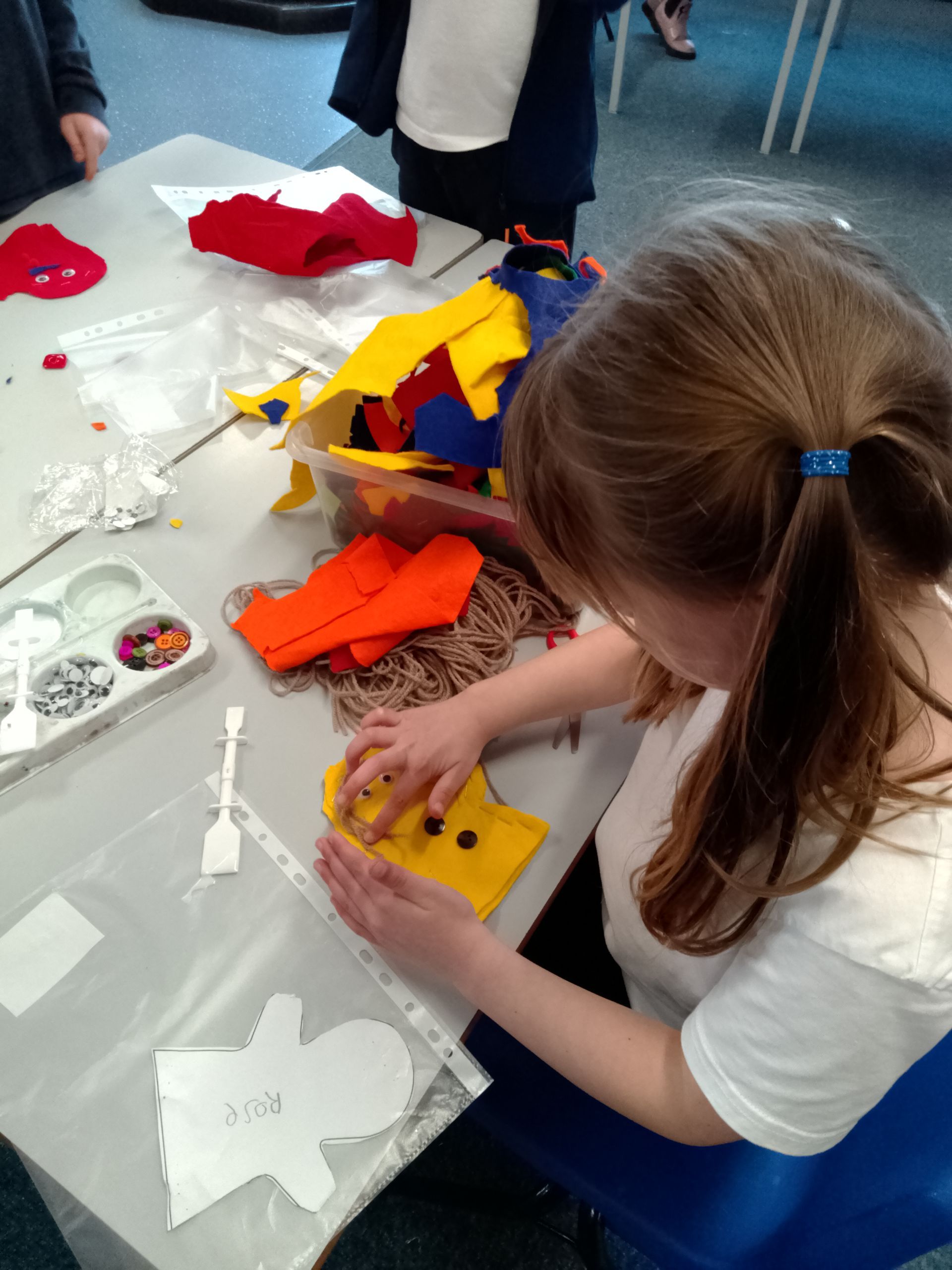 We have also completed our hand puppets which we have spent the last few weeks making. We began by joining materials together by pinning, glueing and stapling. We then created our templates and used these to cut out our puppet shape, joined these together then used buttons, wool and googly eyes to embellish them.