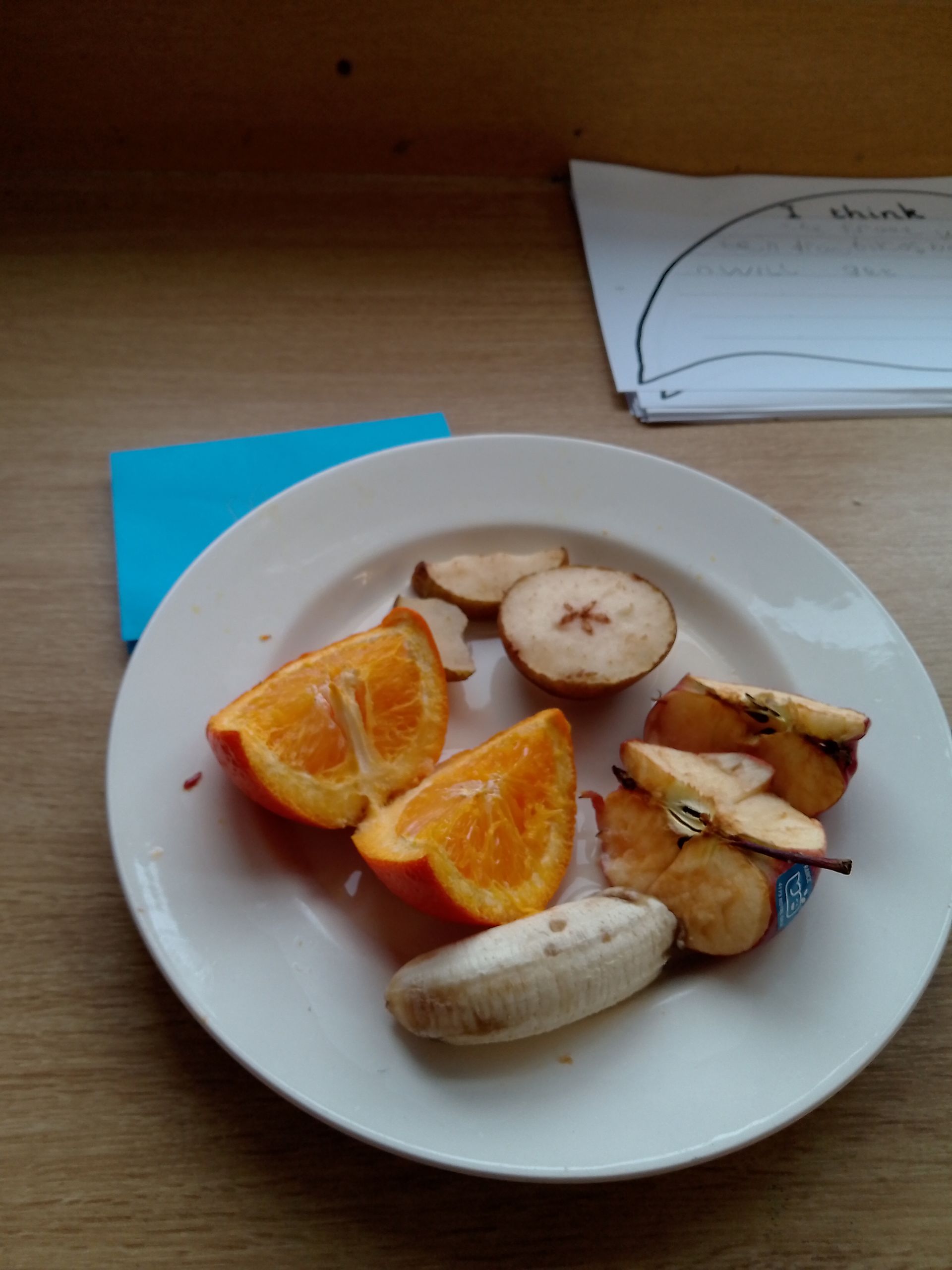 Some of the investigations we completed were watching how fruit decayed over time. We wondered if we put milk on top of the fruit it would slow down the process of decay.