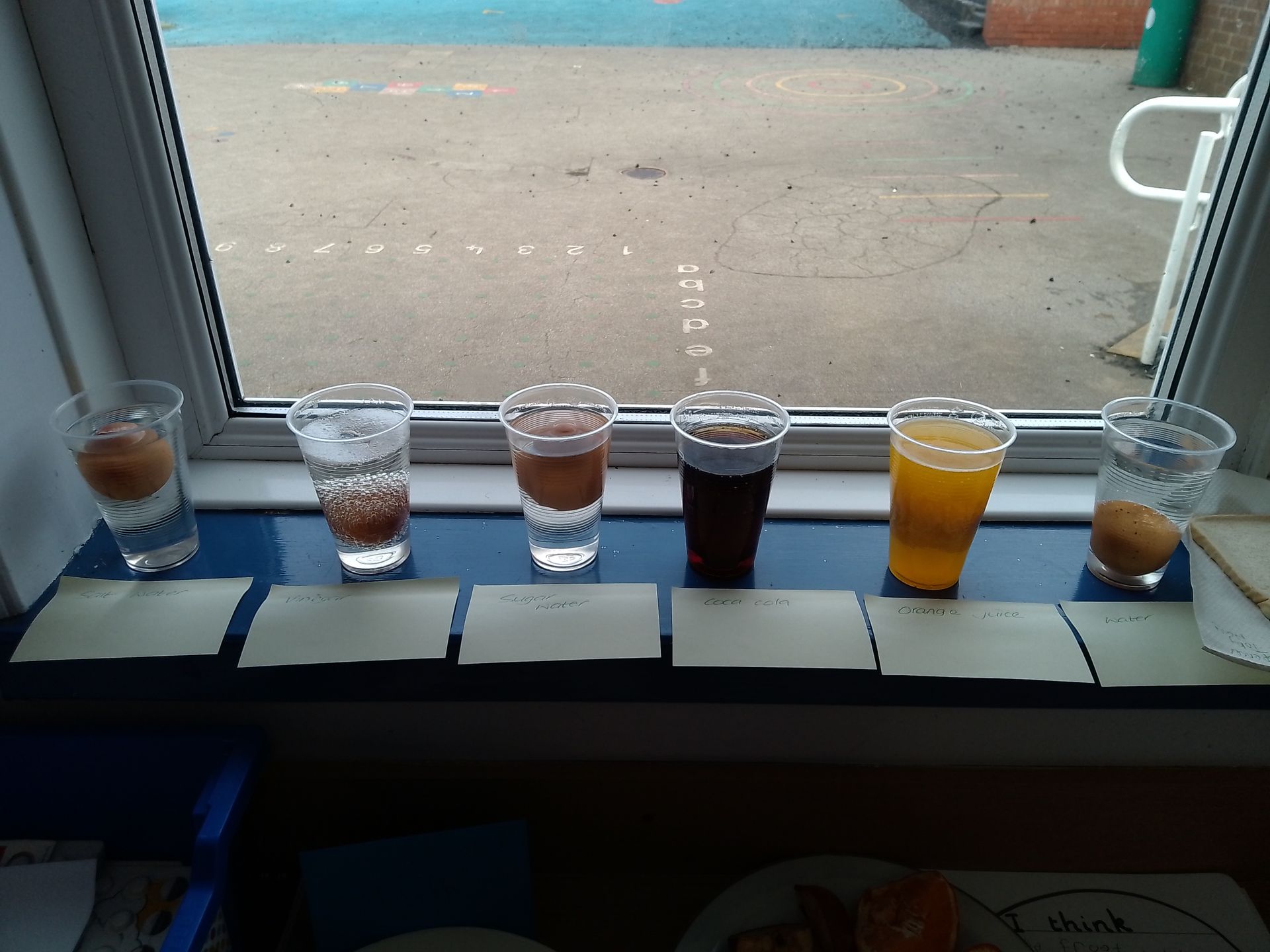 We put an egg in orange squash, coca cola, water, white vinegar, sugar/water and salt/water to see what effect the liquids would have on the shell. We were very surprised to see that the shell of the egg in vinegar had completely disappeared and it now resembled a bouncy ball!