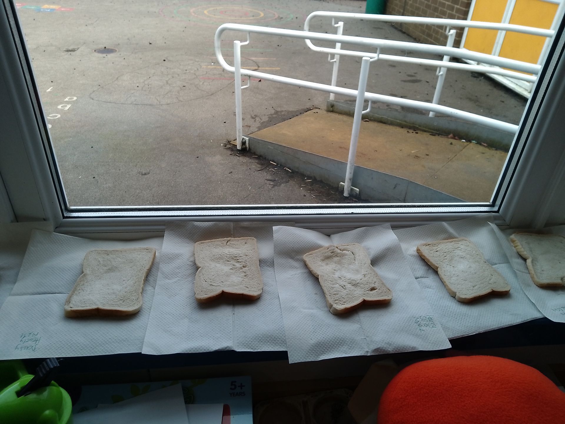 Finally we made sure we had dirty hands and touched some bread all over. Then we cleaned our hands and touched a different slice of bread to see what the effect of washing our hands has on the development of mould and bad bacteria.