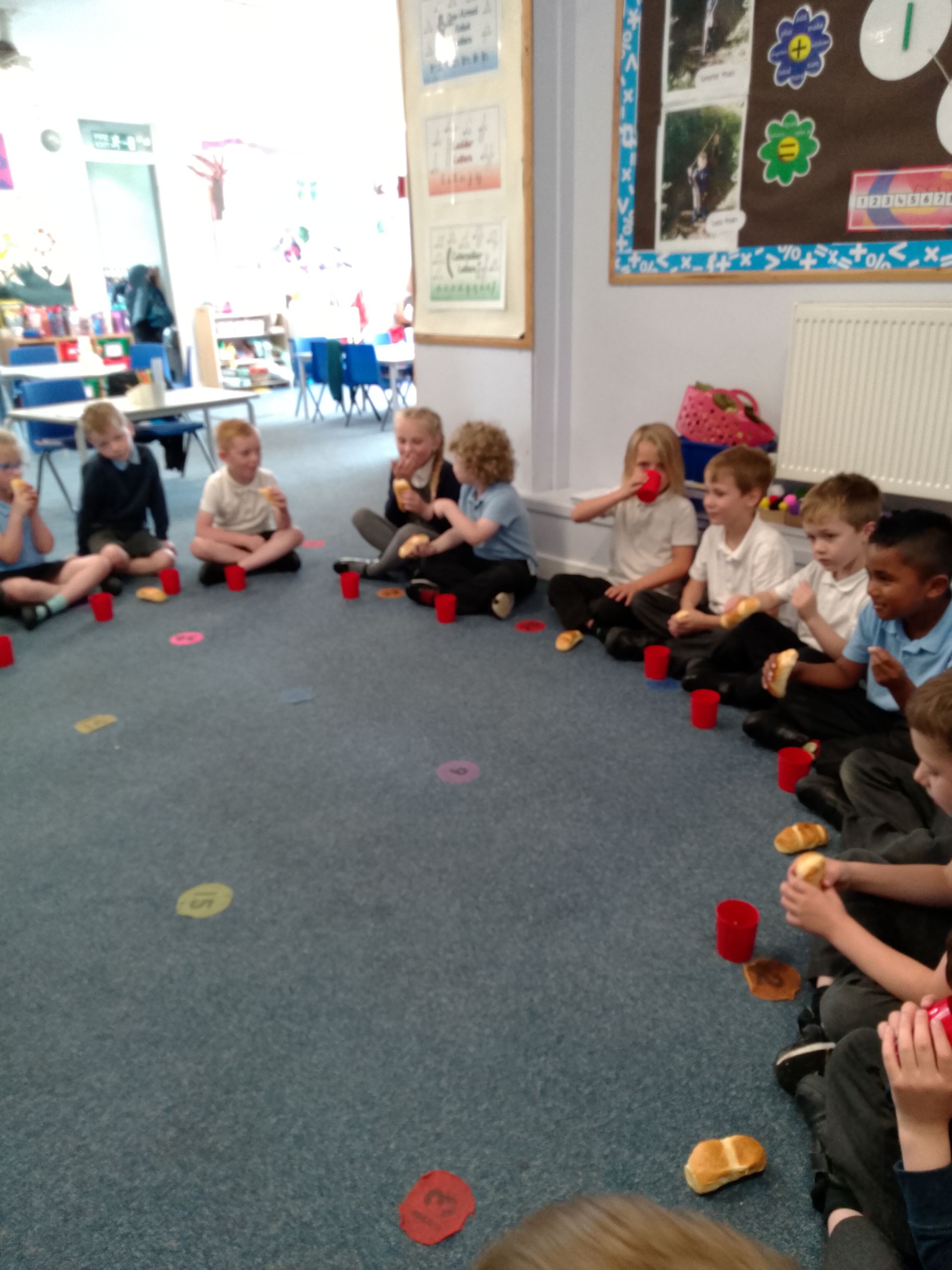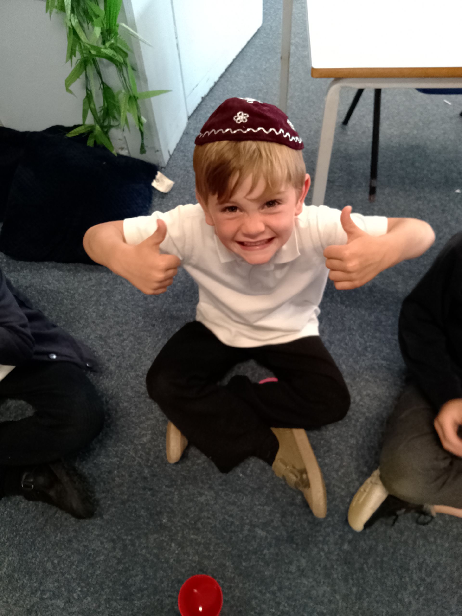 In RE we have been learning about what Jewish children do during Shabbat. We discovered that they share challah bread and drink grape juice so we had our own little Shabbat and shared Brioche and grape juice. We chose Brioche as it has a very similar taste to challah bread. Some of the boys tried on a Kippah which is usually worn by Jewish males.