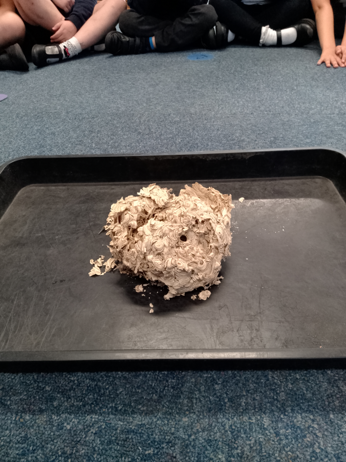 This week in year 1 Miss Dobson brought in an abandoned wasp nest for us to explore. We were fascinated by the intricate shapes that the wasps had created to make their nest. It provoked many questions from the children including how long it took to make, what they made it out of, what were the little hexagonal parts for, how many wasps lived in it and where have they gone now?